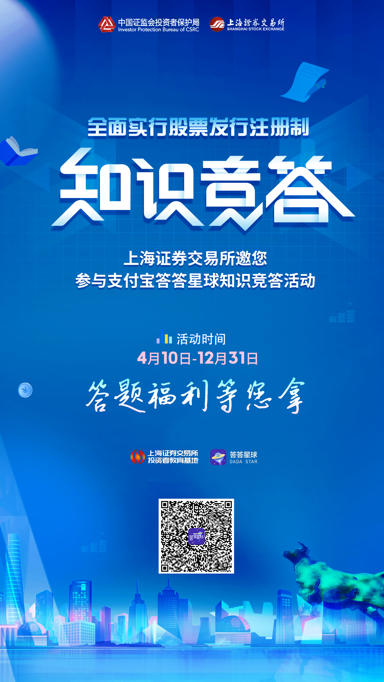 全面实行股票发行注册制之际,为普及投资知识,了解规则制度,树立理性投资、价值投资理念,上海证券交易所邀您参与全面实行股票发行注册制知识竞答。本次活动于4月10日开始,持续至12月31日。参与答题赢福利!